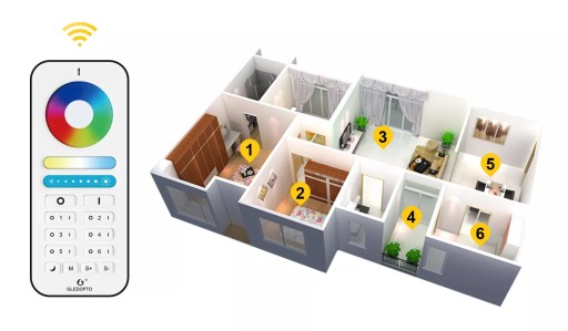 Dzięki pilotowi możemy sterować aż sześcioma strefami, czyli kontrolerami taśm. Oznacza to, że jedno urządzenie pozwoli na zmianę oświetlenia w kilku pomieszczeniach lub nawet całym budynku.