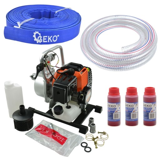 GEKO - POMPA SPALINOWA DO WODY MOTOPOMPA 1" + WĄŻ PCV 1'' 20m 2 BARY + WĄŻ SSAWNY 1" 25mm 5m WZMACNIANY DRUTEM + OLEJ DO SILNIKÓW DWUSUWOWYCH 100 ML x3
