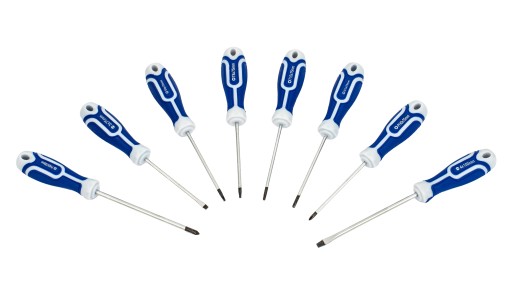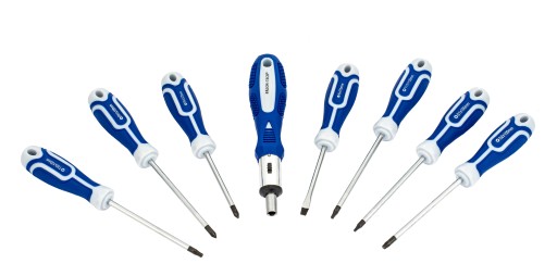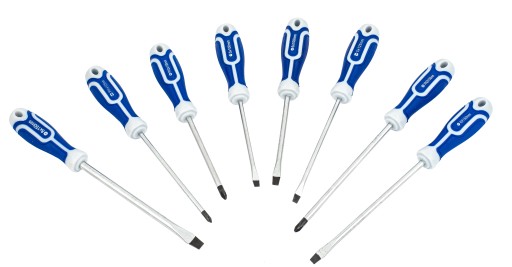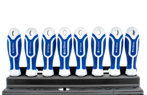 - 8 wkrętaków płaskich: 8x150/6x150/6x100/5x125/5x100/5x75/4x100/3x75 mm