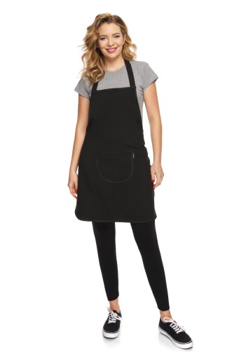 Zakryty przód, wkładany przez głowę, wiązany z tyłu na troczki. Półokrągła kieszeń o wymiarach: szerokość 26 cm wysokość 22,5 umieszczona na przodzie fartuszka. Fartuch bez rękawów, przez co nie ogranicza ruchów. Całość obszyta lamówką w kolorze tkaniny lub innym kolorem warianty dostępne na innych naszych aukcjach.