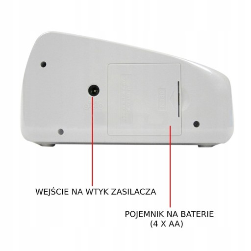 - Zasilanie: Załączony zasilacz (100-240V -50/60Hz AC/DC) lub 4 baterie AA
