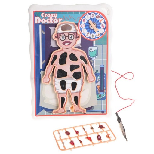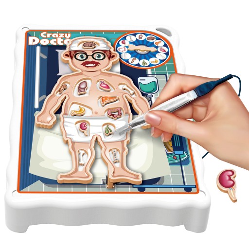 Gra Zręcznościowa Szalony Lekarz od marki WOOPIE. Gra przeznaczona dla dzieci od 4-ego roku życia, w której wcielamy się w doktora i przeprowadzamy operację. Organy umieszczamy w pacjencie, a następnie kręcąc na kole dowiadujemy się jaki organ musimy "usunąć". Należy to robić bardzo precyzyjnie, ponieważ gdy tylko dotkniemy organem naszego pacjenta on zadrży co prowadzi do przegranej. Gra rozwija koordynacje wzrokowo-ruchową, doskonali precyzje, cierpliwość i skupienie.