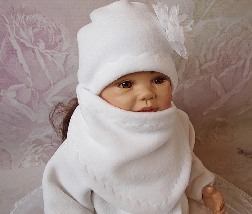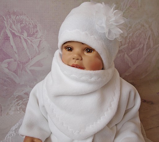 Mamy zaszczyt zaprezentować Państwu śliczny zestaw czapeczkę i chustę pochodzącą naszej pracowni. Czapeczka oraz chusta wykonane są z grubego białego i mięciutkiego polarku. Czapeczka przyozdobiona jest kwiatem i ma wszytą z tyłu gumkę dzięki której łatwiej dopasowuje się do główki dziecka. Chusta zapinana z tyłu na rzep. Ubranko jest bardzo cieplutkie i wygodne. Zestaw jest elegancki a maluszek uroczo będzie w nim wyglądał.