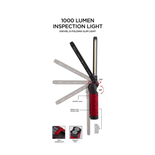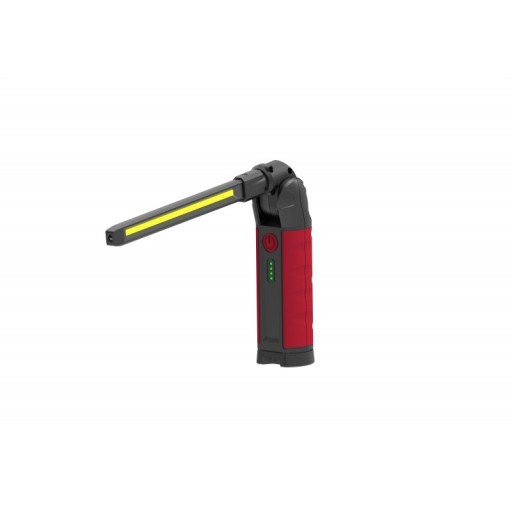 Lampa jest kompaktowa dzięki składanej konstrukcji, a obrotowa głowica (270') daję jej funkcjonalność w każdym obszarze działania na stanowisku pracy. Lampa korzysta z dwóch źródeł światła, głównej diody COB o natężeniu 1000 lum oraz diody na szczycie 200 lum.