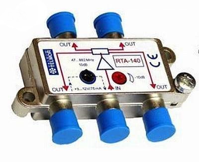 RTA-140 jest to aktywny rozdzielacz sygnału na dwa odbiorniki telewizyjne gdzie sygnał jest dodatkowo wzmocniony + 10dB posiada także regulacje tego wzmocnienia o -10dB, umożliwia także zasilanie wzmacniacza zamontowanego w antenie dzięki zworce którą się przestawia na rozdzielaczu .