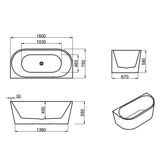 ОТДЕЛЬНОСТОЯЩАЯ НАСТЕННАЯ ВАННА LENA 527C, БЕЛАЯ, ХРОМОВЫЙ ПЕРЕЛИВ, 160x75 СМ