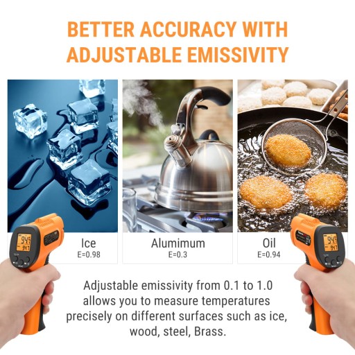 Bardzo dokładny i dopasowuje się do każdej powierzchni: Zaprojektowany z wykorzystaniem najnowszej technologii czujników termoelektrycznych, ten termometr laserowy na podczerwień ma dokładność do ± 1,5%; Ulepsz pomiary za pomocą termometru na podczerwień, dostosowując emisyjność w zakresie 0,1–1,0 w celu dopasowania do mierzonego materiału powierzchni
