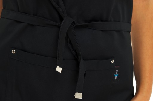 Fartuch o eleganckim nowoczesnym dizajnie idealnie pasuje na każdy typ sylwetki, dzięki odpowiedniemu krojowi oraz tkaninie zawierającej elastan (3%). Solidnie wykonany przez naszą firmę VIPTEXTYLIA. W fartuchu zastosowano wygodne, a zarazem eleganckie rozwiązanie regulacji paska szyjnego poprzez zastosowanie metalowego zapięcia typu karabińczyk po obu stronach fartucha. Wiązany z tyłu lub przodu paskami uszytymi z tej samej tkaniny zakończone metalowymi okuciami, paski oraz kieszeń znajdująca się z przodu fartucha wzmocnione są ozdobnymi nitami.