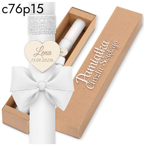 Najbardziej osobisty element to centralnie umocowane serce na świecy, które zostało wygrawerowane z imieniem oraz datą chrztu. To unikalne, ręcznie wykonane wykończenie nadaje świecy niepowtarzalny charakter i sprawia, że staje się ona nie tylko przedmiotem praktycznym, ale także pamiątką na lata.