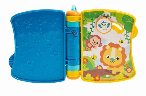 Zabawka wykonana z plastiku w ciekawej kolorystyce. Każda strona książeczki zawiera inną kolorową ilustację. To doskonała okazja do nazywania obrazków, opowiadania historyjek i rozwijania wyobraźni. Kiedy przekręcamy strony, książeczka wydaje łagodne dźwięki. Ruchome elementy można naciskać, przekręcać, przesuwać. Książeczka gra wówczas melodyjki. Dzięki temu dziecko bawiąc się ćwiczy małą motorykę. Uchwyty do przekręcania stron książeczki mają różnorodne faktury, co w naturalny sposób rozwija zmysł dotyku.