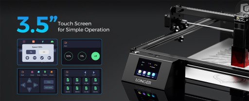 Grawerowanie i cięcie offline instalacji przez kolorowy ekran dotykowy 3,5 cala. Podczas grawerowania i cięcia nie jest potrzebne korzystanie z komputera, co ułatwia korzystanie z różnych funkcji dla majsterkowiczów. Ekran dotykowy 3,5 cala jest dostępny zarówno w modelu Ray5 5W, jak i 10W.