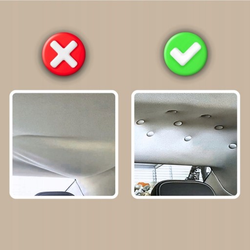 Zawiera 60 szt. beżowych nitów naprawczych, 60 szt. kolorowych pinezek, 1 śrubokręt i 1 centymetr. Naprawa nie wymaga dużo czasu ani profesjonalnych narzędzi. Idealne rozwiązanie dla każdego samochodu, który wymaga renowacji podsufitki