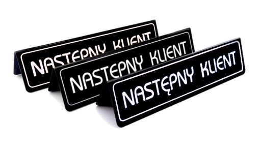 Stojak z napisem NASTĘPNY KLEINT z modnego w sezonie tworzywa, które imituje tablicę kredową.