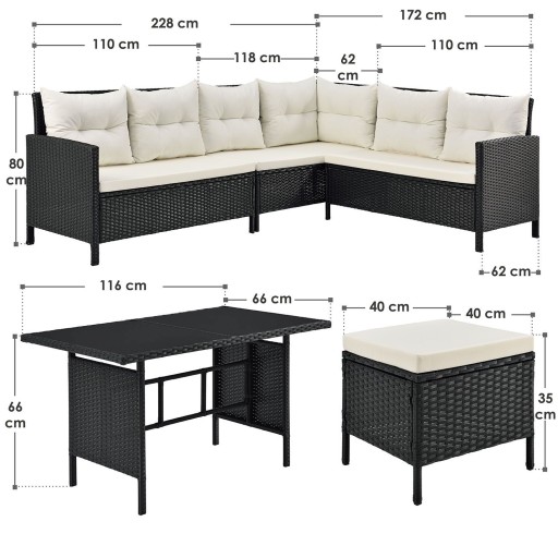 Dzięki polyrattanowemu narożnikowi ogrodowemu z czarnym oplotem, przekształcasz swoją przestrzeń na zewnątrz w stylowe miejsce do relaksu i odpoczynku. Wytrzymała konstrukcja stalowa i odporne na warunki atmosferyczne włókna z poli rattanu sprawiają, że meble ustawione na tarasie pod altaną czy w ogrodzie bardzo ładnie się prezentują. Duży stolik ze szklanym blatem służy jako miejsce do postawienia żywności i napojów. Grube poduszki siedziska i oparcia gwarantują trwały komfort. Wieczory towarzyskie z rodziną, przyjaciółmi lub sąsiadami będą wspaniałym relaksem na świeżym powietrzu.