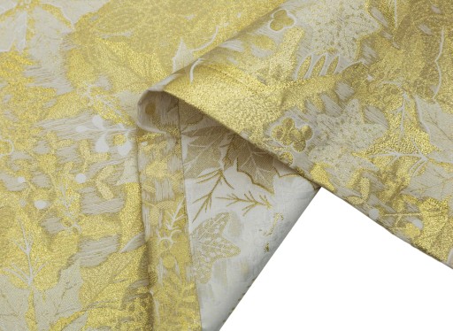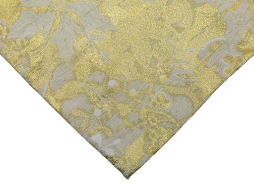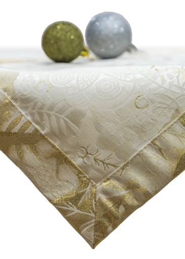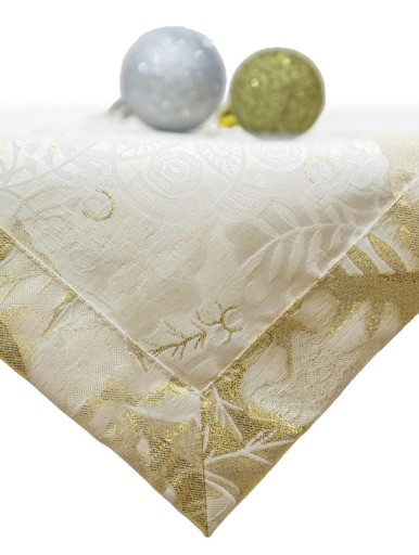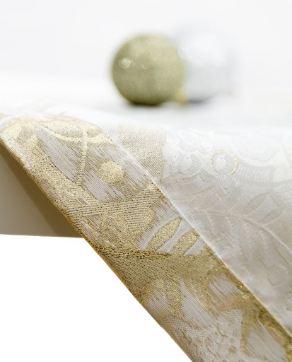 Kremowo-złoty, błyszczący tablecloth o wyjątkowo eleganckim zestawieniu motywów powodujących, że obrus nie jest "przeładowany". Gwiazda betlejemska w gustownych kolorach ecru i i świetlistego złota na pewno zrobi duże wrażenie na domownikach.