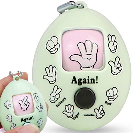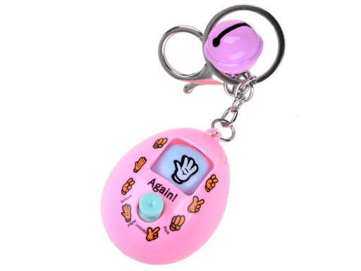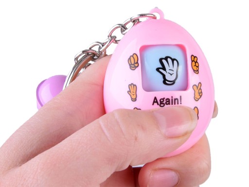 Kolorowy breloczek w kształcie jajka z grą świetnie sprawdzi się przy plecaku szkolnym, torebce. Breloczek ma wbudowana popularną grę "kamień, papier, nożyce" wystarczy nacisnąć przycisk, a wirująca łapka pokaże nam dany znak. Fajny gadżet sprawdzi się podczas czekania na autobus, czy podjęcia zakładu z kumplem.Jajko na łańcuszku ma koluszko do zapięcia i karabińczyk.