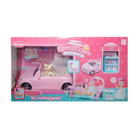 Plastikowe auto bez dachu z uroczą laleczką w sukni ślubnej w środku. Samochód można rozłożyć i urządzić przyjęcie ponieważ w zestawie znajdują się takie akcesoria jak: stół, tort, prezenty, krzesła, sztućce. Produkt zapakowany w kartonowe opakowanie.