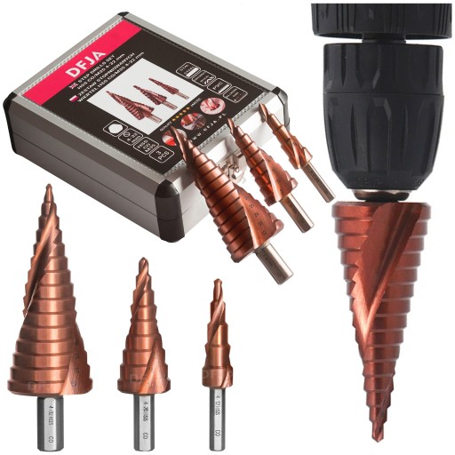 ZESTAW WIERTEŁ STOPNIOWYCH STOŻKOWYCH SPIRALNYCH MARKI DFJA HSS CO/M35 - 3 sztuki + etui