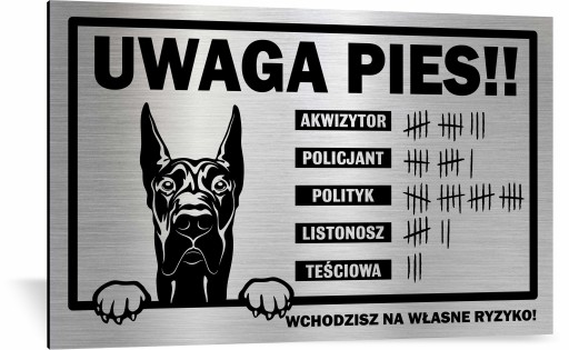 TABLICZKA "UWAGA PIES" 32 x 21 cm. WYKONANA Z DIBONDU SZCZOTKOWANEGO, ZADRUKOWANA METODĄ UV. BARDZO TRWAŁA I ELEGANCKA. DLA UŁATWIENIA WYSZUKIWANIA WSZYSTKIE PLIKI Z RASAMI PSÓW SĄ UŁOŻONE ALFABETYCZNIE.