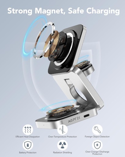 Bezprzewodowa stacja ładująca 3 w 1 Bezprzewodowa ładowarka magnetyczna AGPTEK jest dostarczana z adapterem QC3.0, który zapewnia bezpieczeństwo i szybkie ładowanie 3 urządzeń jednocześnie. Kompaktowy i stylowy wygląd, pożegnaj się z kłopotami związanymi ze splątanymi kablami ładującymi, utrzymując porządek i porządek na biurku. Urządzenie obowiązkowe dla fanów Apple.