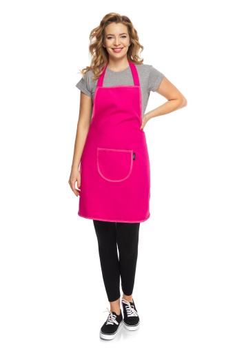 Zakryty przód, wkładany przez głowę, wiązany z tyłu na troczki. Półokrągła kieszeń o wymiarach: szerokość 26 cm wysokość 22,5 umieszczona na przodzie fartuszka. Fartuch bez rękawów, przez co nie ogranicza ruchów. Całość obszyta lamówką w kolorze tkaniny lub innym kolorem warianty dostępne na innych naszych aukcjach.