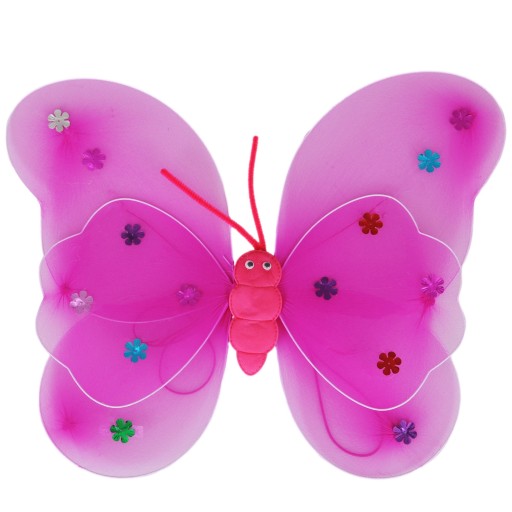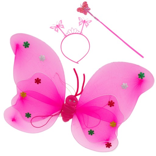 Śliczny kostium dla dziewczynki składający się z 3 elementów: skrzydeł, opaski oraz różdżki. Idealny na bal przebierańców, występy, przedstawienia, bale, imprezy domowe, sesje fotograficzne itp.
