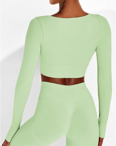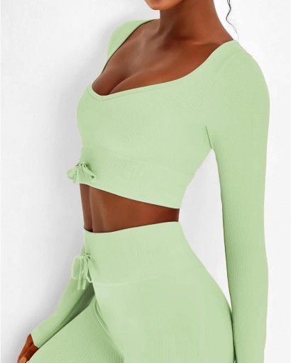 Cechy: Długie rękawy, dekolt w kształcie litery U, wysoki stan, 2-częściowe bezszwowe zestawy treningowe z długim rękawem, z bezpiecznym prążkowanym brzegiem zapewniającym antypoślizgowe wsparcie, sztuczny sznurek do ściągania zapewniający sportowy charakter, który zapewnia pełny komfort ruchu podczas treningu.