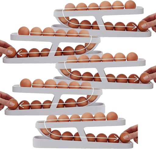 Roll Eggs Down :Gravity-fed design makes the Egg Dispenser practical. A track that is sloped releases eggs at a time. The eggs will immediately roll out of the outlet when you remove the eggs from it.
