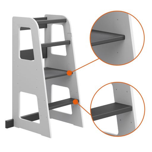 Pomocnik posiada regulowane trzy drewniane poziomy, tym samym dopasowując się do wzrostu dziecka.