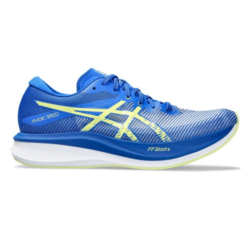 Buty Asics Magic Speed 3 1011B703 400 to buty treningowo-startowe. Przeznaczone do startu w zawodach i treningu bieganego ze zwiększoną szybkością. Buty posiadają piankę FF Blast + w podeszwie środkowej. Dodatkowo w podeszwie środkowej znajduje się płytka z włóknem węglowym, która nadaje butowi sztywność i stabilność. Buty Magic Speed to superszybkie buty do biegania, z karbonową płytą w podeszwie środkowej. Cholewka Motion Wrap zapewnia lepszą przewiewność. Waga obuwia 218g, drop 7 mm , buty neutralne.