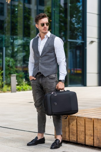 Szelki plecaka są bardzo solidnie wykonane i wyłożone miękką gąbką, dzięki czemu wygodnie się nosi. Plecak posiada dwie rączki dla większego komfortu przenoszenia, można go przenosić trzymając go w rękach w pionie i poziomie. Uchwyt z boku plecaka sprawia, że plecak zamienia się w bardzo elegancką torbę na laptopa. Dodatkowo na pleckach produktu umieszczono specjalny pasek, który idealnie sprawdzi się podczas transportu na walizce.