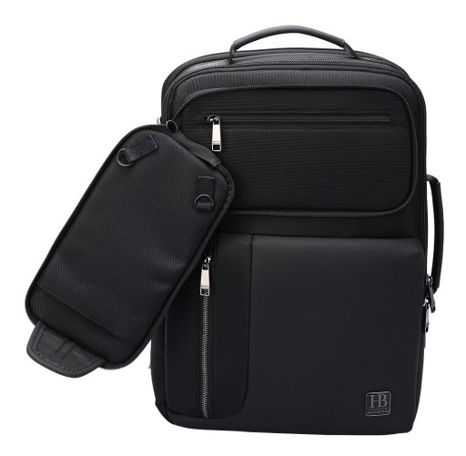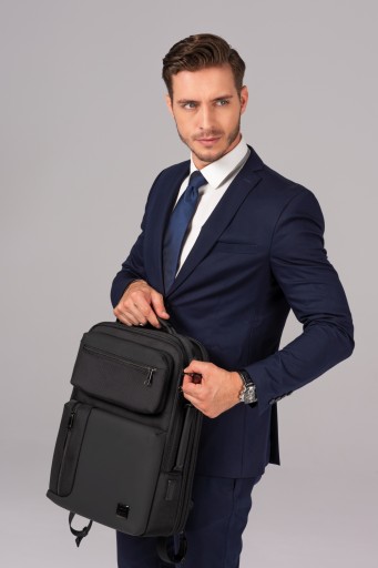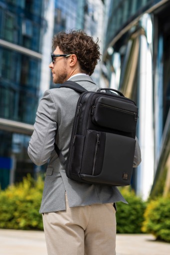 Dużym atutem tego plecaka na laptopa jest dodatkowa odpinana górna kieszonka, która może być używana jako samodzielna saszetka. Od frontu plecak posiada trzy niezależne kieszenie zamykane na suwak oraz jedną odpinaną kieszeń, która może być używana jako saszetka i być zabierana gdy nie potrzebujemy całego plecaka. Kieszenie posiadają solidne zamki.