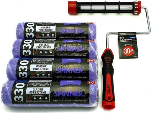 Blue Dolphin 330 SPINNER to wałek malarski wykonany z innowacyjnego materiału, pokryty poliestrem, który lepiej chłonie i oddaje farbę, a przy tym nie zostawia włosia. Jego zaletą jest też nieskomplikowane mocowanie. Nawet przy wielokrotnym użyciu zachowuje swoją początkową puszystość. Dzięki zastosowaniu skosów na końcach wałka, wyeliminowane jest nawarstwianie się farby na krawędziach. zystkimi rodzajami farb po większych powierzchniach gładkich. Wałek ten maluje dając w efekcie wyjątkowo gładką powierzchnię.
