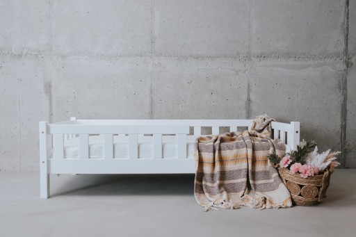 Łóżko z barierką w kolorze białym, szarym lub lakierowane