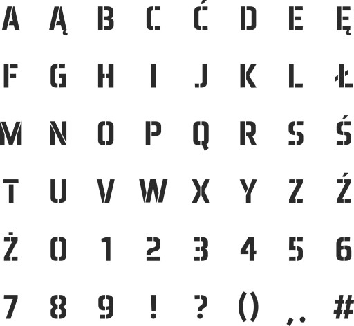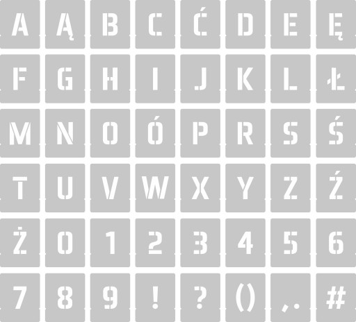 Na komplet składa się 48 szablonów zawierających alfabet polski, cyfry od 0 do 9 oraz podstawowe znaki interpunkcyjne - każdy znak na osobnym arkuszu