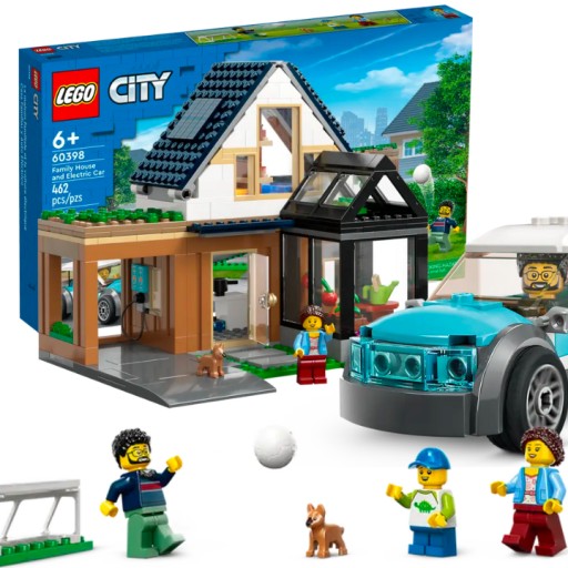 Zestaw LEGO® City "Domek Rodzinny i Samochód Elektryczny" (60398) przeznaczony dla dzieci w wieku sześciu lat i starszych, oferuje modułowe pomieszczenia, takie jak oranżeria z jadalnią, kuchnia, dwie sypialnie i łazienka, które można dowolnie łączyć. Zabawkowy domek wyposażony jest w stację ładowania pojazdu elektrycznego, panele słoneczne i płytę drogową LEGO, kompatybilną z innymi zestawami z serii LEGO City. Dodając trzy minifigurki i figurkę szczeniaczka, dzieci mogą spędzić wiele godzin na kreatywnej zabawie.