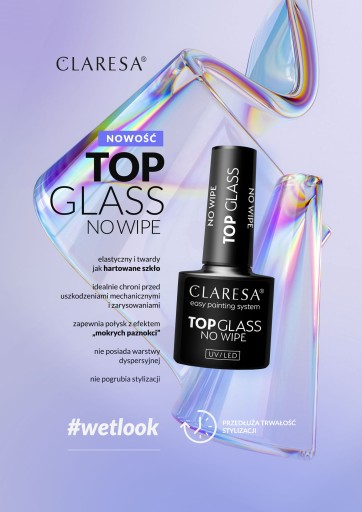 Claresa Glass Top to właśnie płynne szkło hartowane dla Twoich paznokci! Uniwersalny transparentny top hybrydowy nadaje się zarówno do przedłużonych paznokci, jak i naturalnej płytki. Jego formuła jest elastyczna, doskonale chroni przed uszkodzeniami mechanicznymi i zapewnia połysk z efektem mokrych paznokci. Top nie pogrubia płytki, jednocześnie dokładnie ją zabezpieczając. Produkt idealnie oddaje kolor lakierów hybrydowych ‒ i jasnych, i tych ciemnych. Nie wymaga przemywania warstwy dyspersyjnej.