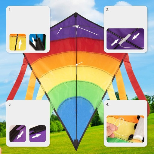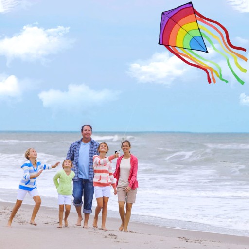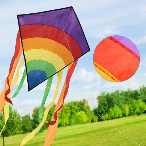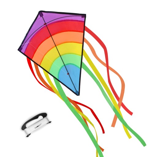 tęczowy latawiec o wymiarach 73 x 65 cm z 8 dopasowanymi kolorowymi ogonami o długości 105 cm, z 80 m linką latawca. Zestaw latawców , łatwy do złożenia, idealny dla początkujących.