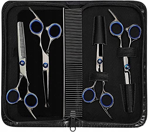 - 【Wielofunkcyjne nożyczki do przycinania】Nożyce do salonu dla psów i grzebień ze stali nadają się doskonale do usuwania splątanych włosów, mat, luźnych włosów i zabrudzeń, a także do stymulowania skóry i mieszków włosowych. Proste nożyczki są przeznaczone do cięcia włosów, przede wszystkim do płaskich części sierści zwierząt. Nożyce do cieniowania są używane do cieniowania włosów. Dwa zakrzywione nożyczki są przeznaczone do rzęs, nosa, twarzy, uszu, brzucha, bioder itd. zwierząt domowych.