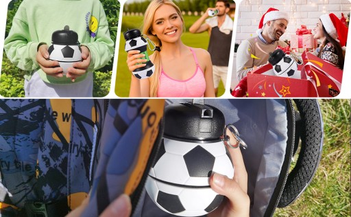 ⚽Składana konstrukcja – po rozłożeniu końcówki butelki na wodę wyglądają jak połowa piłki nożnej, a po całkowitym złożeniu butelka przyjmuje okrągły kształt piłki nożnej.