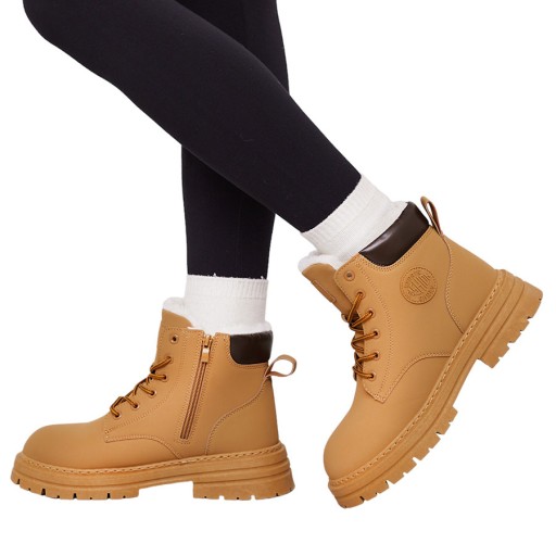 Ocieplane trapery damskie, wykonane z eko nubuku. Cholewka wiązana, w środku ocieplenie w formie futerka. Konkretne buty na złą pogodę!