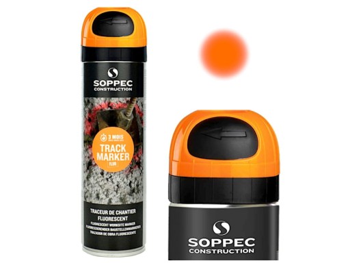Track Marker firmy Soppec to farba fluorescencyjna w aerozolu przeznaczona do wykonywania oznaczeń na placach budowy oraz do znakowania przy pracach geodezyjnych i pomiarowych. Z jej pomocą wykonamy widoczne, odblaskowe oznaczenia, podkreślając niebezpieczne strefy, zaznaczając pole pod wykop lub znacząc dokonane pomiary. Dzięki farbie Track Marker niewielkim kosztem, znacznie zwiększymy bezpieczeństwo na budowie i usprawnimy pracę. Aerozol stosowany jest w sytuacjach gdy długotrwałe oznaczenia nie są pożądane, utrzymując się na znaczonym obszarze do 3 miesięcy.