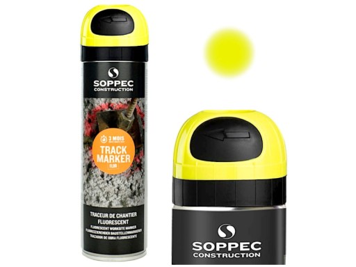 Track Marker firmy Soppec to farba fluorescencyjna w aerozolu przeznaczona do wykonywania oznaczeń na placach budowy oraz do znakowania przy pracach geodezyjnych i pomiarowych. Z jej pomocą wykonamy widoczne, odblaskowe oznaczenia, podkreślając niebezpieczne strefy, zaznaczając pole pod wykop lub znacząc dokonane pomiary. Dzięki farbie Track Marker niewielkim kosztem, znacznie zwiększymy bezpieczeństwo na budowie i usprawnimy pracę. Aerozol stosowany jest w sytuacjach gdy długotrwałe oznaczenia nie są pożądane, utrzymując się na znaczonym obszarze do 3 miesięcy.