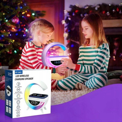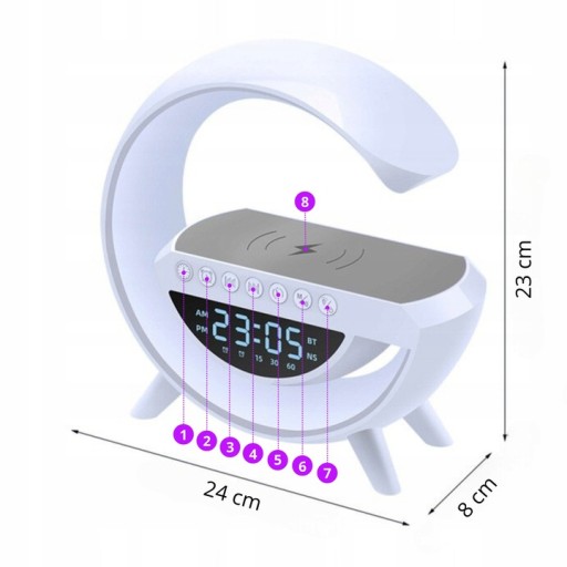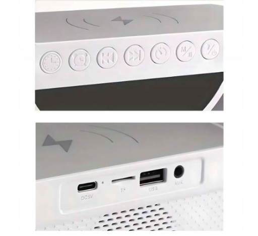 Inteligentna Lampa LED RGB Ładowarką QI Głośnik BT Radio FM Budzik 6W1