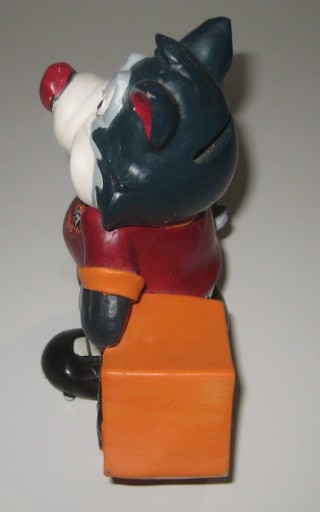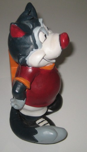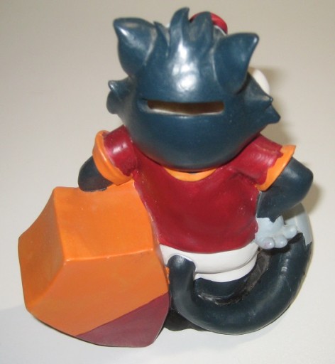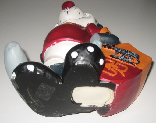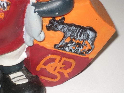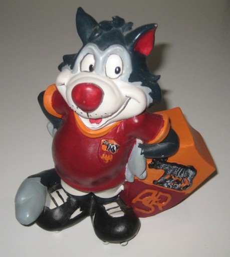 Romolo - figurka/skarbonka w barwach AS Roma. Otwór do opróżniania pieniędzy na dole w podstawie. Wysokość: 20 cm. Materiał: utwardzone tworzywo plastyczne. Używana. Stan jak na zdjęciach. Z Włoch. Cena za 1 szt.