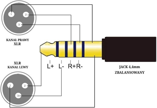 Przeznaczenie: Pozwala na podłączenie źródła dźwięku wyposażonego w wyjście zbalansowane 4,4mm do wzmacniacza za pomocą wtyków XLR (Schemat połączeń na złączach przedstawiony jest na zdjęciu)