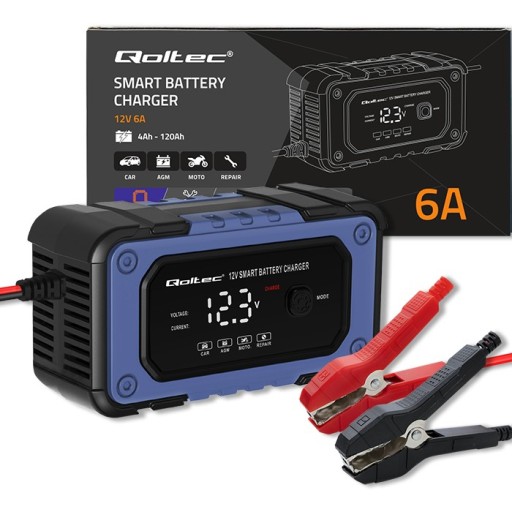 Qoltec Inteligentna mikroprocesowa ładowarka do akumulatora AGM GEL z funkcją naprawy | 12V | 6A | LED | 4 tryby