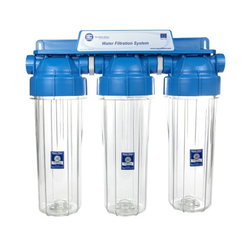 Zestaw składa się ze stelaża oraz trzech przezroczystych korpusów na wkłady filtrujące o standardowych wymiarach 10x2,5 cala.