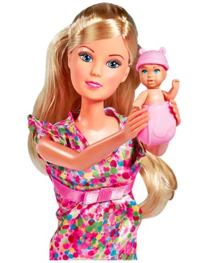 Zabawa Steffi w ciąży i jej nowo narodzonym niemowlakiem bądź niemowlakami to lekcja empatii i pozwala dziewczynce wejść w rolę odpowiedzialnej opiekunki.
