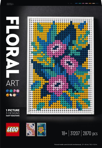 Kwiaty, wszędzie kwiaty — wpuść do domu odrobinę przyrody i ciesz się kolorami, budując zestaw LEGO® Art Sztuka kwiatowa (31207) z trzema motywami do wyboru, które można modyfikować do woli W sam raz do wyeksponowania — wciągający zestaw 2870 klocków LEGO® dla pasjonatów zawiera sześć płytek konstrukcyjnych, ramkę zbudowaną z klocków, paletę kolorów, separator kloców oraz dwa wieszaki Zamiłowanie do projektowania — wyraź swoją miłość do kwiatów i radosnych kolorów oraz zbuduj artystyczny obraz LEGO®, który możesz wyeksponować w dowolnym miejscu Ciesz się kolorami — przenieś się do strefy relaksu, radości i skupienia. Zbuduj kwiatowe dzieło sztuki w kolorach, które najbardziej pasują do wystroju wnętrza Twojego domu Daj wyraz kreatywności — wybierz własny kwiatowy motyw oraz tło, a gdy najdzie Cię ochota na coś nowego, zmień obraz na inny. Możesz stworzyć własną ozdobę, która będzie wszędzie pasować Doskonały prezent — ten zestaw LEGO® Art ma ok. 40 cm wysokości i 27 cm szerokości. Sprawdzi się też jako prezent dla wszystkich fanów kwiatów, kolorów i kreatywnych projektów — takich jak Ty Ilustrowane instrukcje — instrukcje w formie albumu ułatwiają budowanie i stanowią źródło inspiracji. Pomogą Ci wyeksponować piękne, kolorowe dzieło, które doda klimatu wystrojowi wnętrza Hobbystyczny projekt dla dorosłych — zestawy LEGO® Art dla dorosłych pozwalają tworzyć ozdoby wnętrz. Przenieś się do świata artystów i kolorów oraz rozwiń swoją pasję do kreatywnego rękodzieła Wysoka jakość — elementy konstrukcyjne LEGO® spełniają najwyższe standardy jakości, dzięki czemu zawsze mają jednolity wygląd, pasują do siebie i za każdym razem można ich z łatwością używać — i tak jest niezmiennie od 1958 roku Bezpieczeństwo przede wszystkim — testujemy elementy LEGO®, aby mieć pewność, że każdy zestaw konstrukcyjny LEGO Art spełnia surowe wymogi bezpieczeństwa, dzięki czemu zestaw Sztuka kwiatowa jest niezwykle solidny